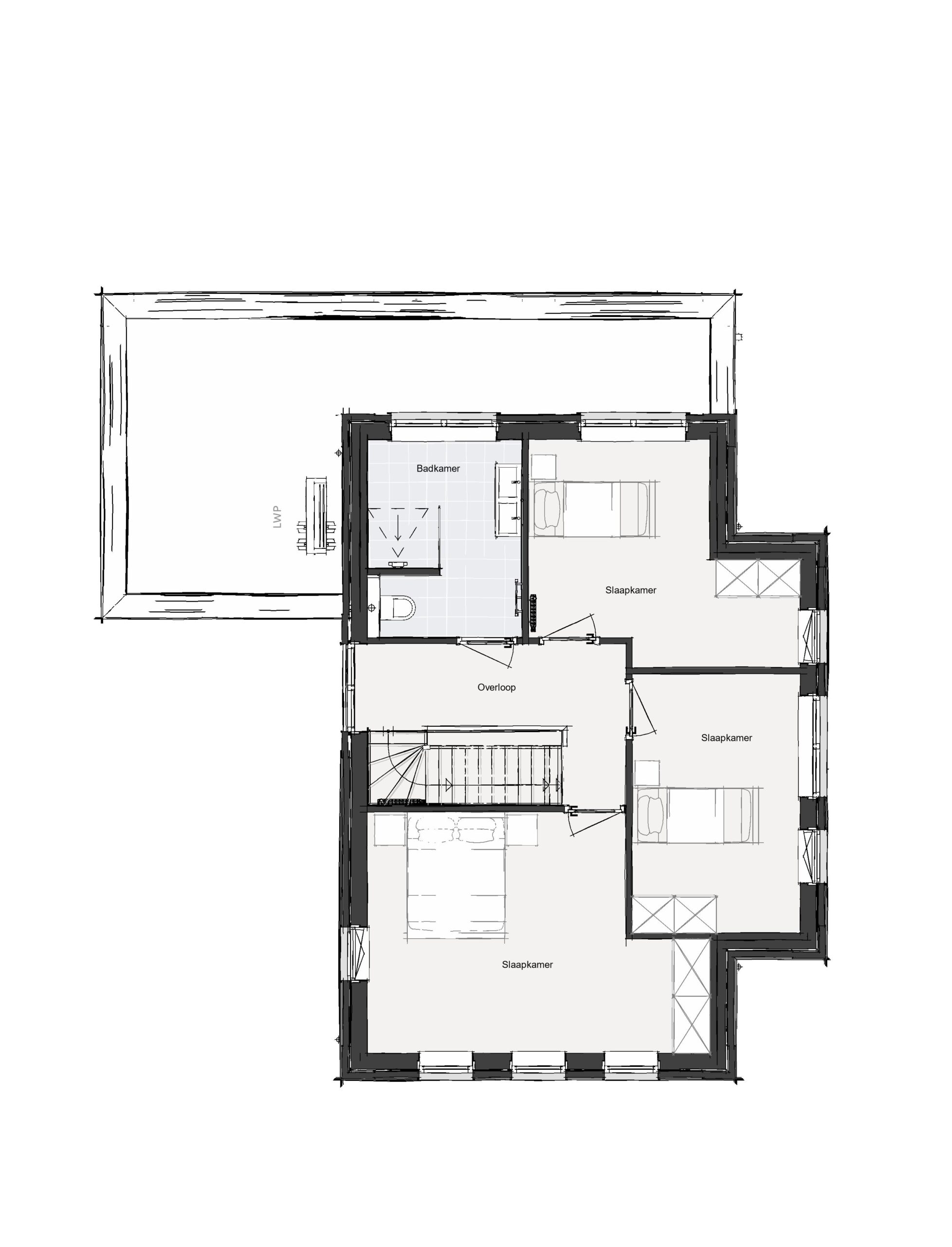 • De rechter woning, op kavel 1, heeft de entree aan de zijkant. Vanuit de hal kan je de ruime woonkamer aan de voorzijde en de zeer ruime keuken aan de achterzijde bereiken, waar uitbreidingen mogelijk zijn om de ruimte af te stemmen op jouw wensen. Op de eerste verdieping zijn drie slaapkamers en een badkamer aanwezig. Op de tweede verdieping bevinden zich nog twee slaapkamers en een wasruimte. Ook hier zijn er opties voor nog andere indelingen mogelijk, waarbij bijvoorbeeld nog een extra badkamer gerealiseerd kan worden.