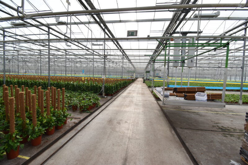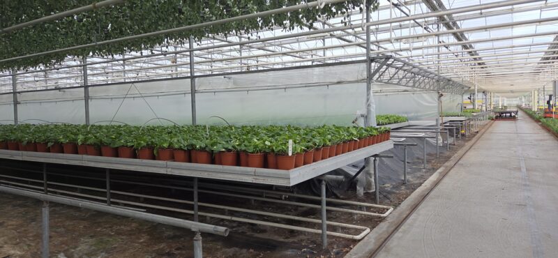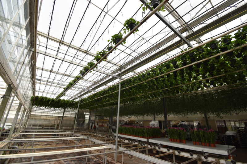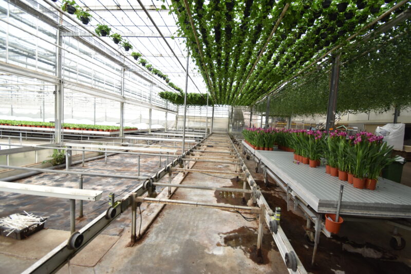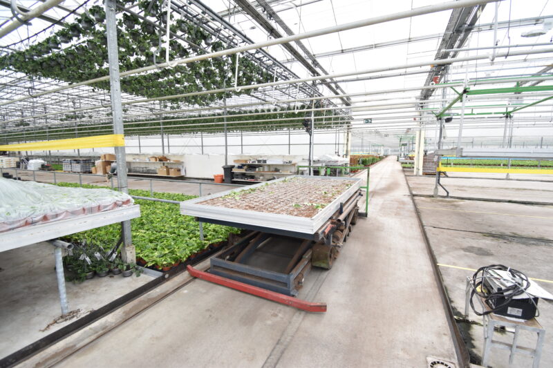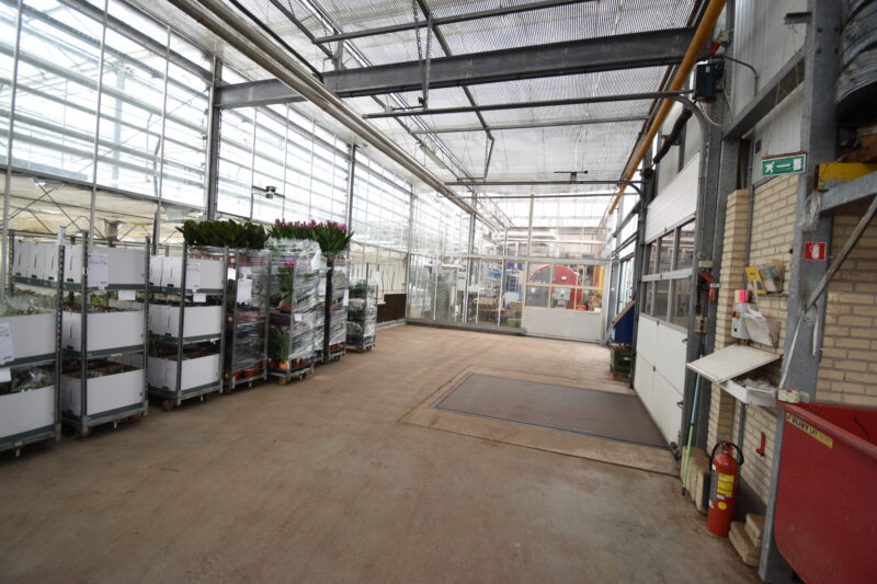 • Via de tweede rollenbaan, in de bedrijfsruimte, vindt het “veiling klaar” maken plaats. Volgroeide planten komen middels rollenbanen vanuit de kas, de bedrijfsruimte in, waardoor met vele mensen tegelijk en op goede werkhoogte deze werkzaamheden kunnen worden uitgevoerd.