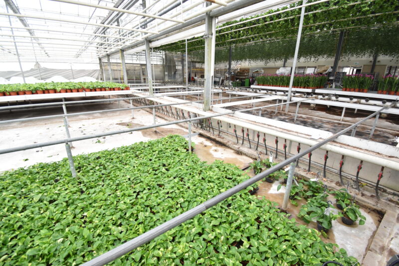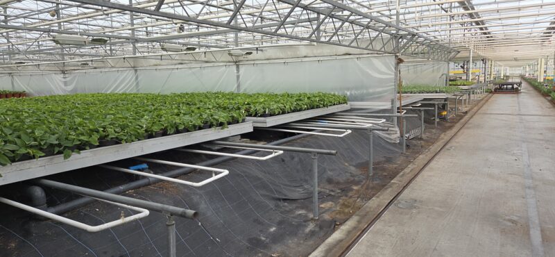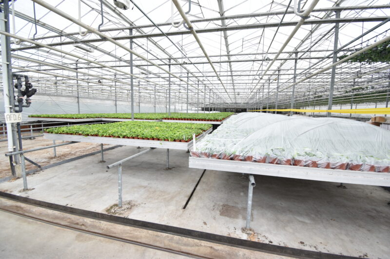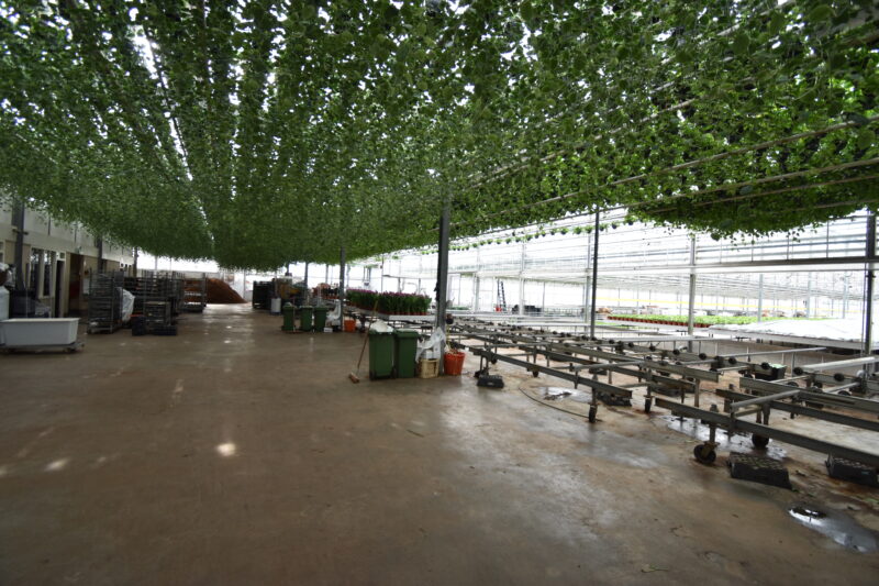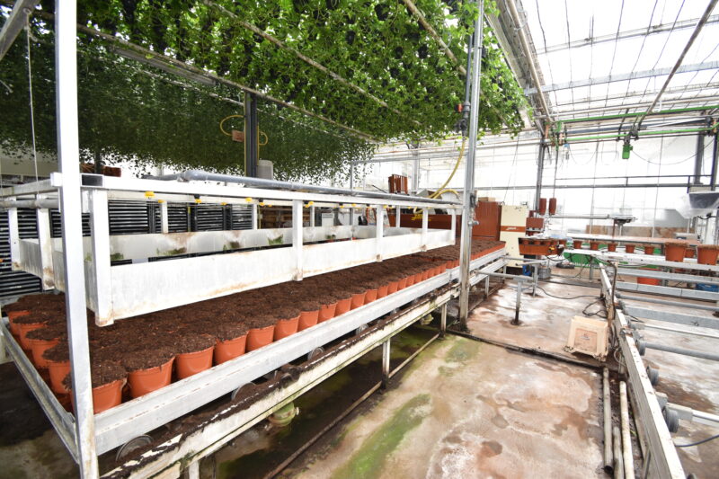 • Afdeling 6 deels voorzien van rolcontainersysteem (380 stuks), met eb- en vloedbodem (2025), deels (5 x 8 m¹ kap) “dradensysteem” voor hangplanten voorzien van druppelslangen, type Netafim Kameleon, t.b.v. hang- moerplantensysteem. 4 kappen hier zijn niet voorzien van een betonvloer, maar gronddoek (moerplanten afdeling).