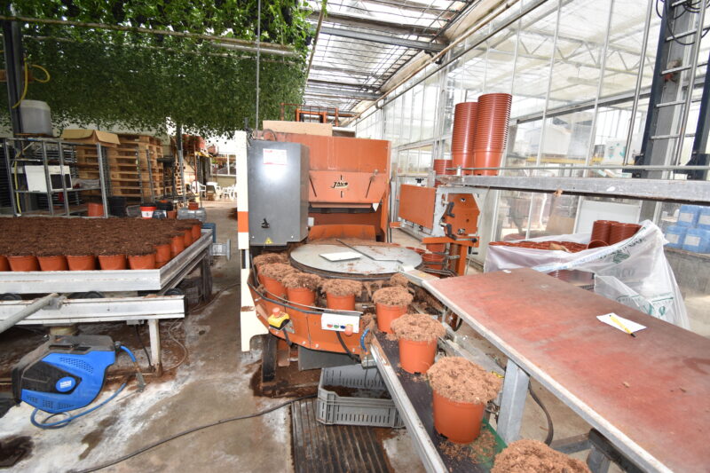 • In de bedrijfsruimte staat een oppotmachine opgesteld welke, een “uitloop” heeft naar twee mogelijkheden om de planten naar de kas te transporteren: