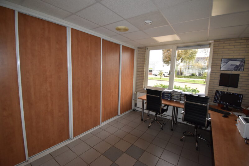 • Vergaderruimte, voorzien van tegelvloer, systeemplafond en schuifkastenwand.
