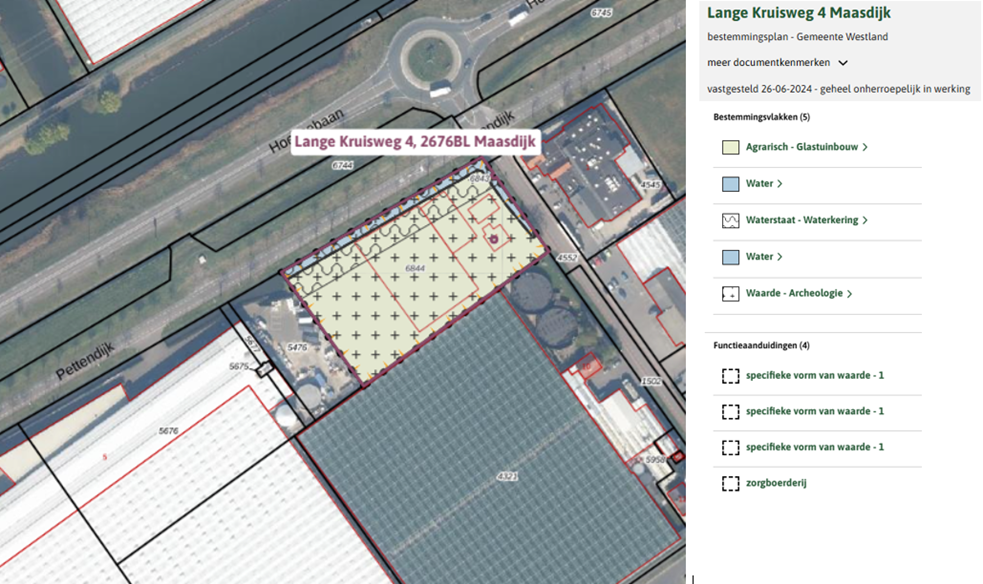 • De bestemming van dit registergoed is Agrarisch Glastuinbouw, met een “functieaanduiding” Ter plaatse van deze functieaanduiding is ondergeschikte horeca toegestaan, waarbij het bruto vloeroppervlak maximaal 5% van het bebouwde oppervlak mag bedragen en voor detailhandel, waarbij het bruto vloeroppervlak voor detailhandel, met toebehoren, maximaal 10% van het bestemmingsvlak mag bedragen.