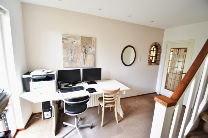 • Hal/kantoor met meterkast, gestuukt plafond met inbouwspots en vaste trap naar eerste verdieping.