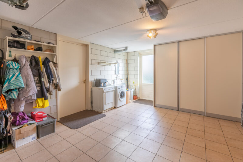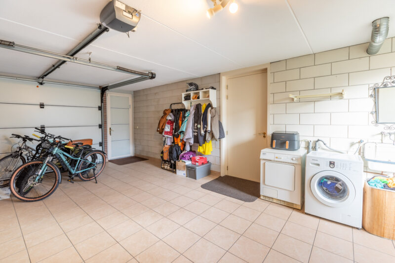 • Zeer ruime garage van circa 30 m², elektrische kanteldeur met afstandsbediening. Vloer volledig betegeld en voorzien van vloerverwarming, loopdeur aan de voor- en achterzijde en een “binnendoor” naar de keuken. Vaste kastenwand, wasmachine en drogeraansluiting en wasbakje.