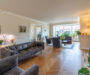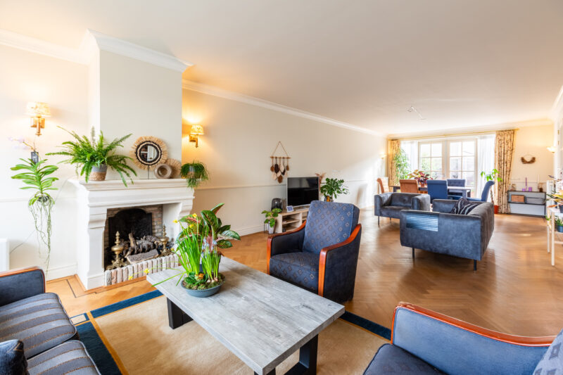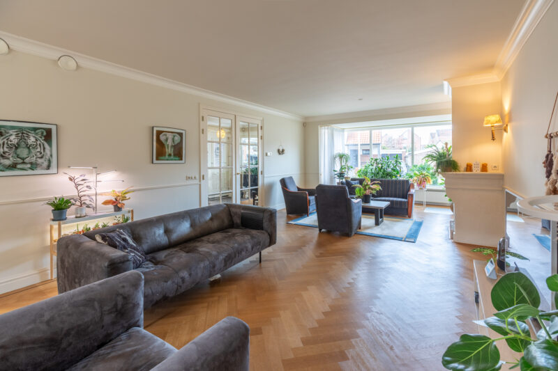 • Ruime lichte woonkamer met erker, dubbele deuren naar de hal en de keuken. Strak gestuukte plafond, tegen de wanden voorzien van sierlijsten en voorzien van inbouwspots. Natuurstenen schouw met gashaard. Terrasdeuren naar de zonnige tuin, welke op het zuiden is gelegen.